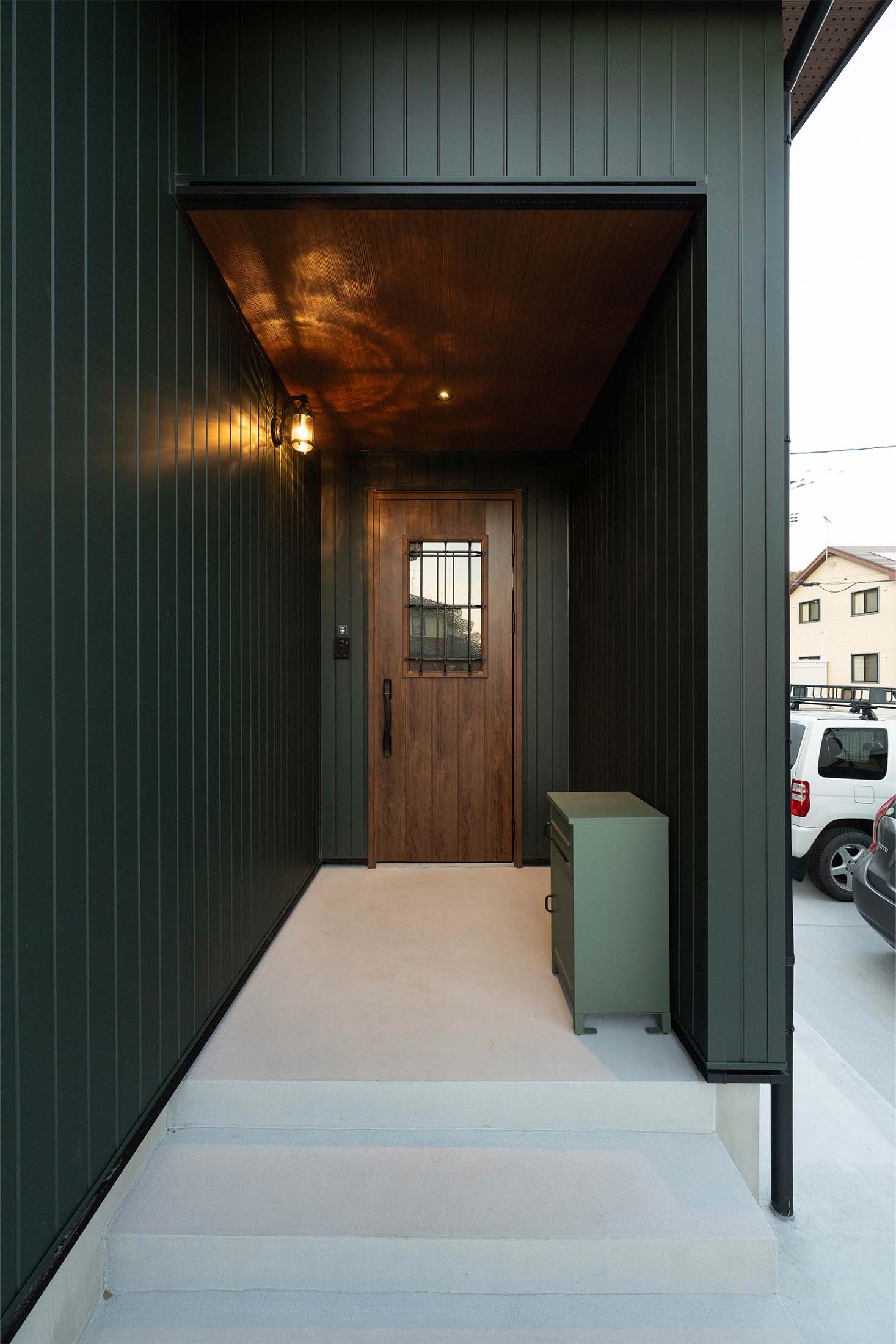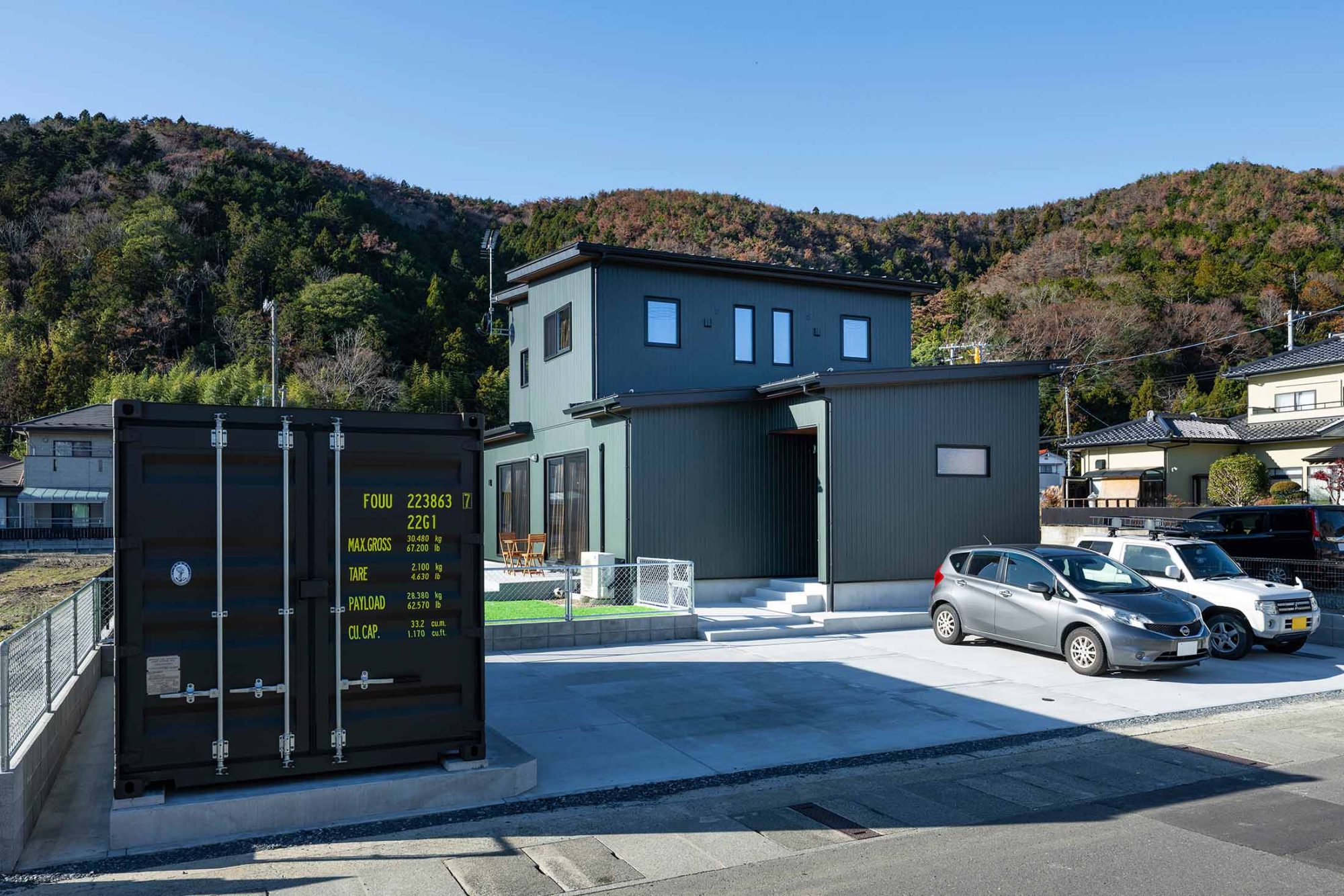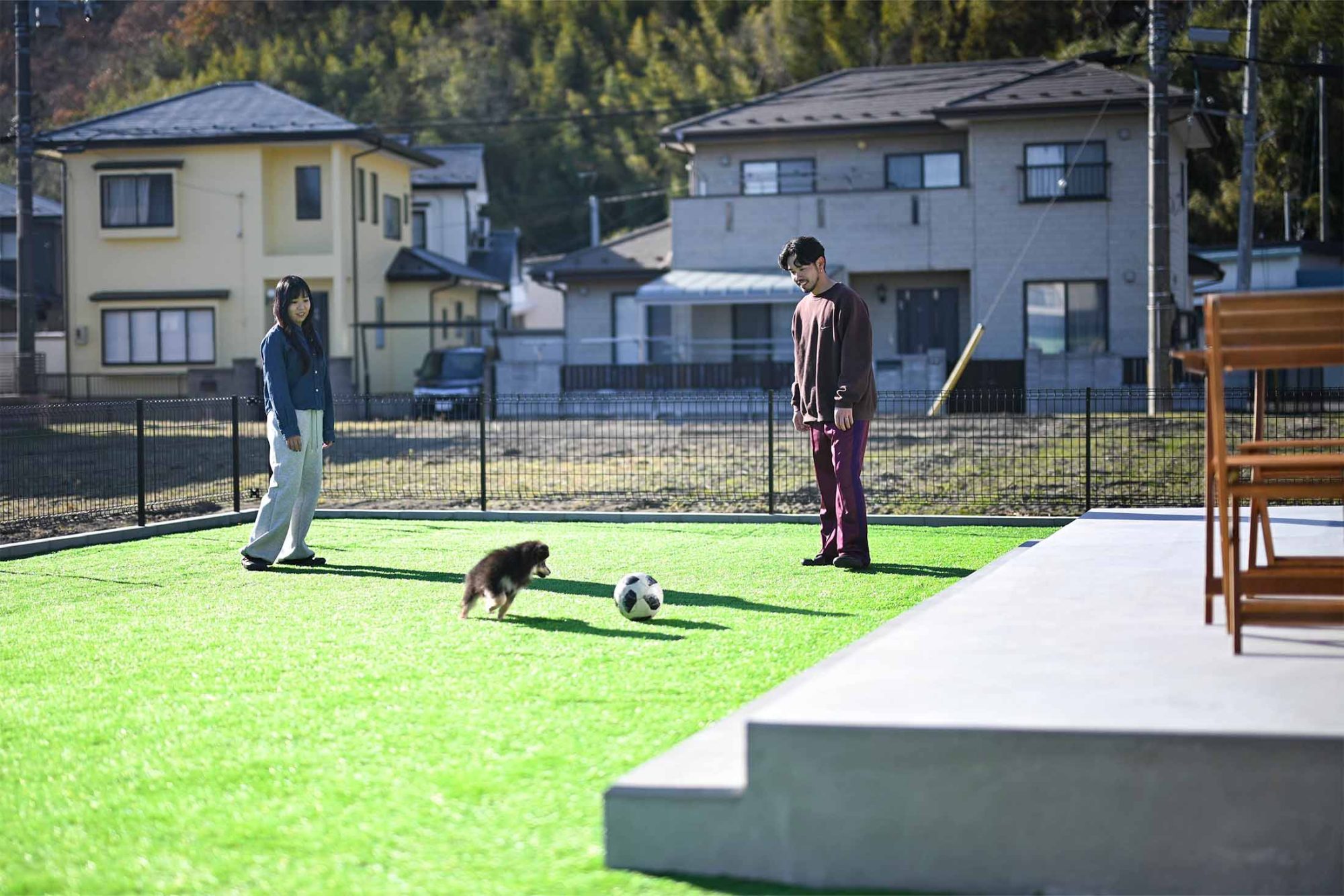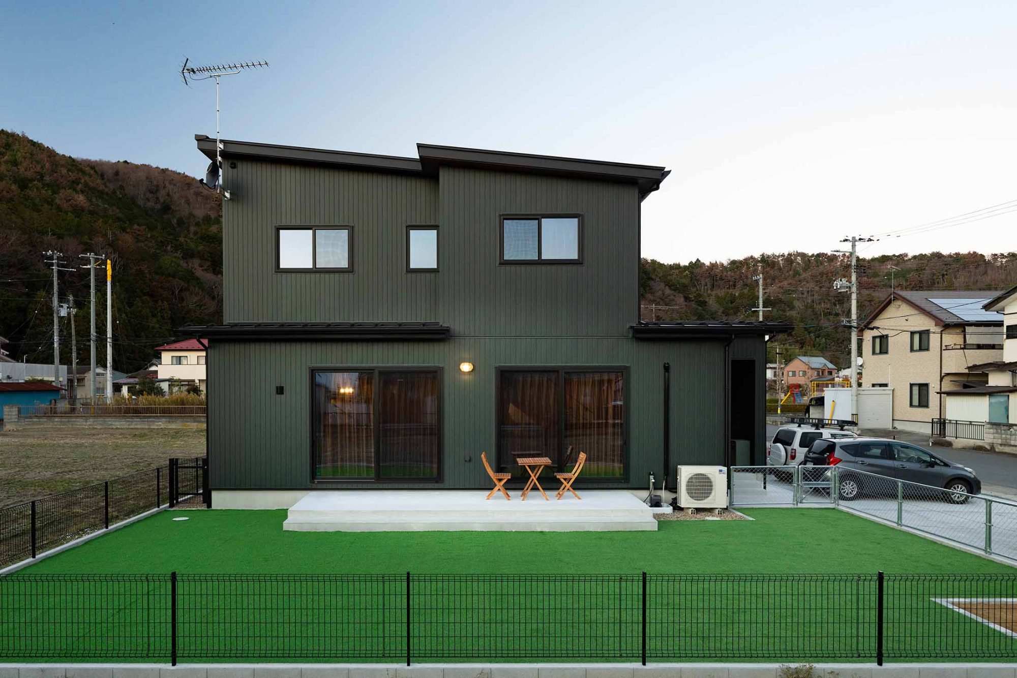 ブルックリンスタイル、リビング階段、吹き抜け、コンクリートデッキ、ドッグランなど、家づくりにおいてお二人は明確なイメージを持っていました。完成した新居は、深いグリーンのガルバリウム鋼板を使ったシックな外観が印象的。庭はドッグランとして使えるようスチールメッシュフェンスで囲い、人工芝も敷きました。