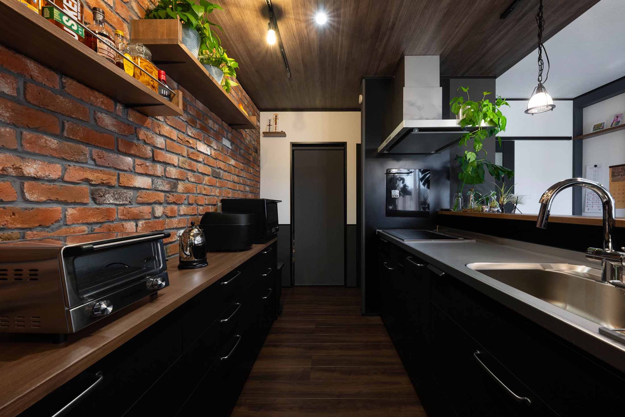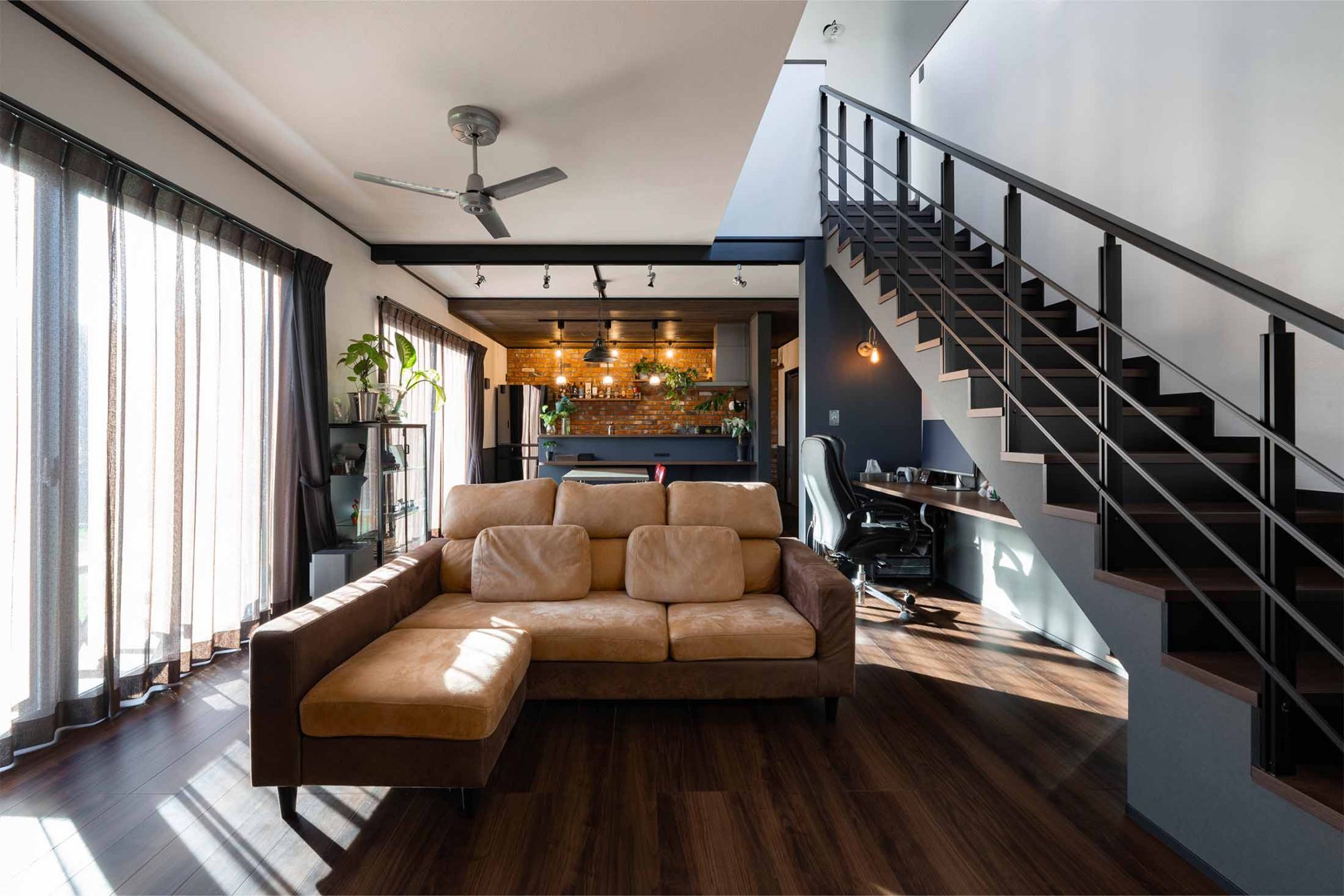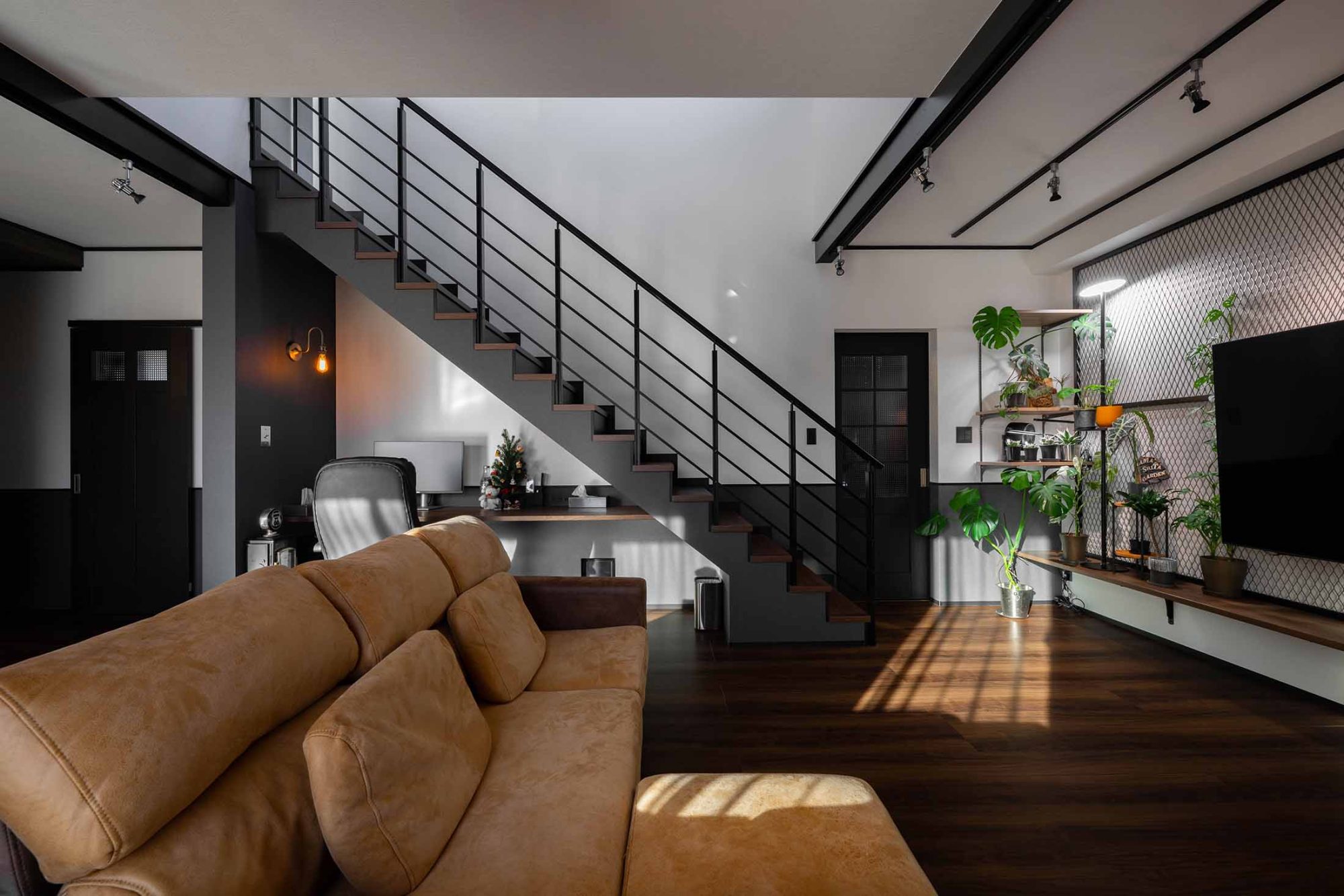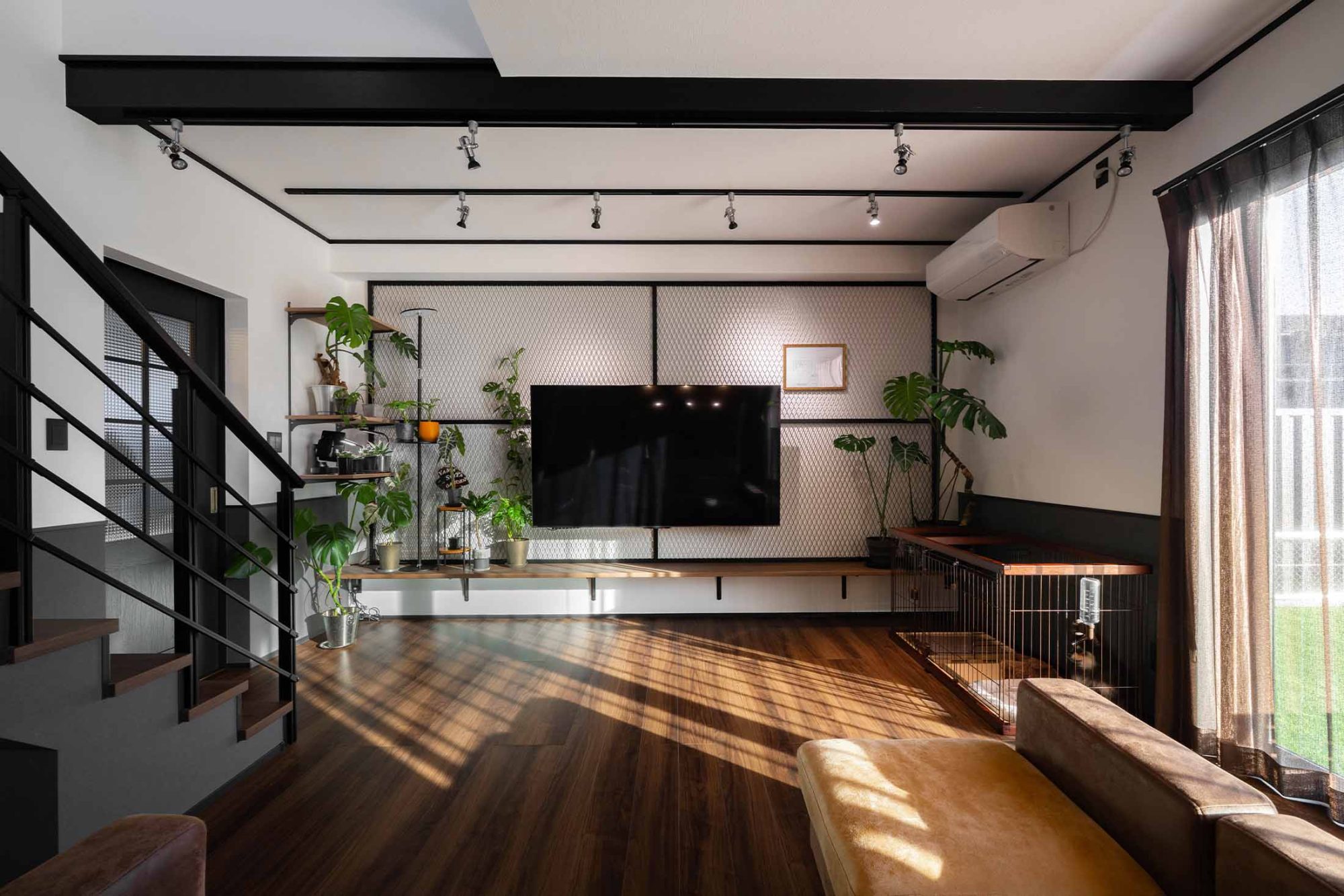 室内は、濃茶系色のフローリングに黒をベースにした建具など、ヴィンテージ感あふれる空間。アイアンの手すりがスタイリッシュなリビング階段と、その上部に広がる天井高約6mの吹き抜けが空間をより広く演出します。観葉植物の栽培が共通の趣味というご夫妻が植物を飾るためテレビの裏の壁に設置したエキスパンドメタルや、キッチンのレンガ調タイルもインダストリアルな雰囲気を演出します。