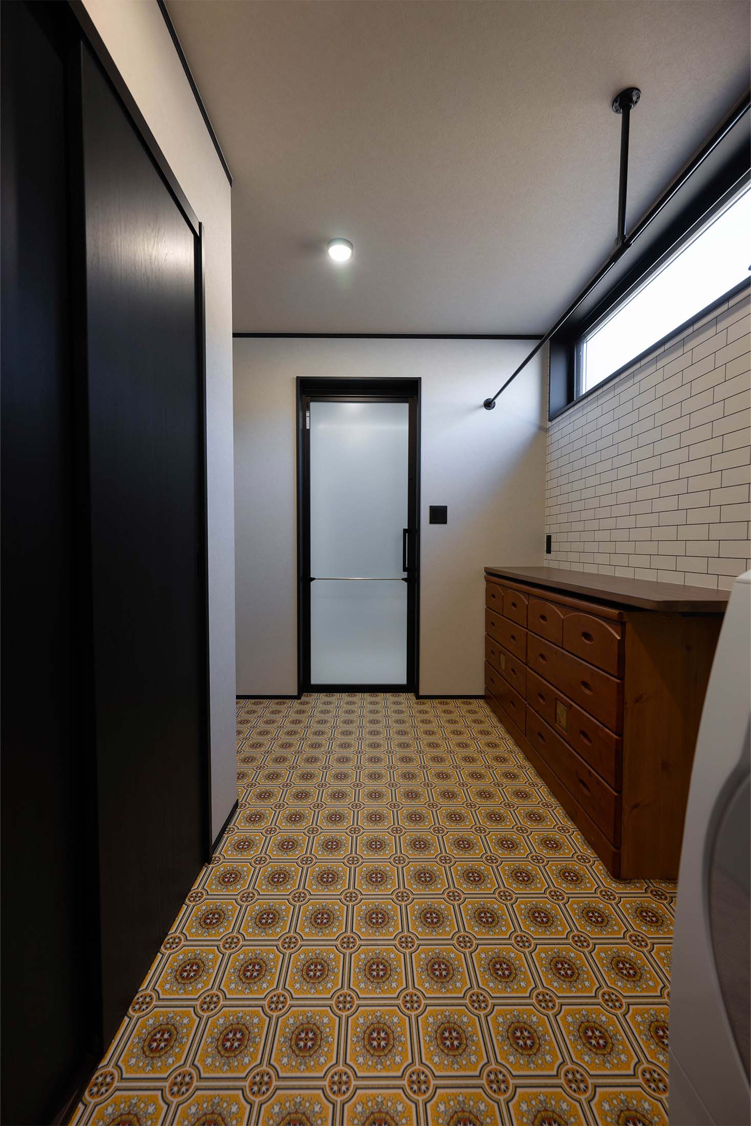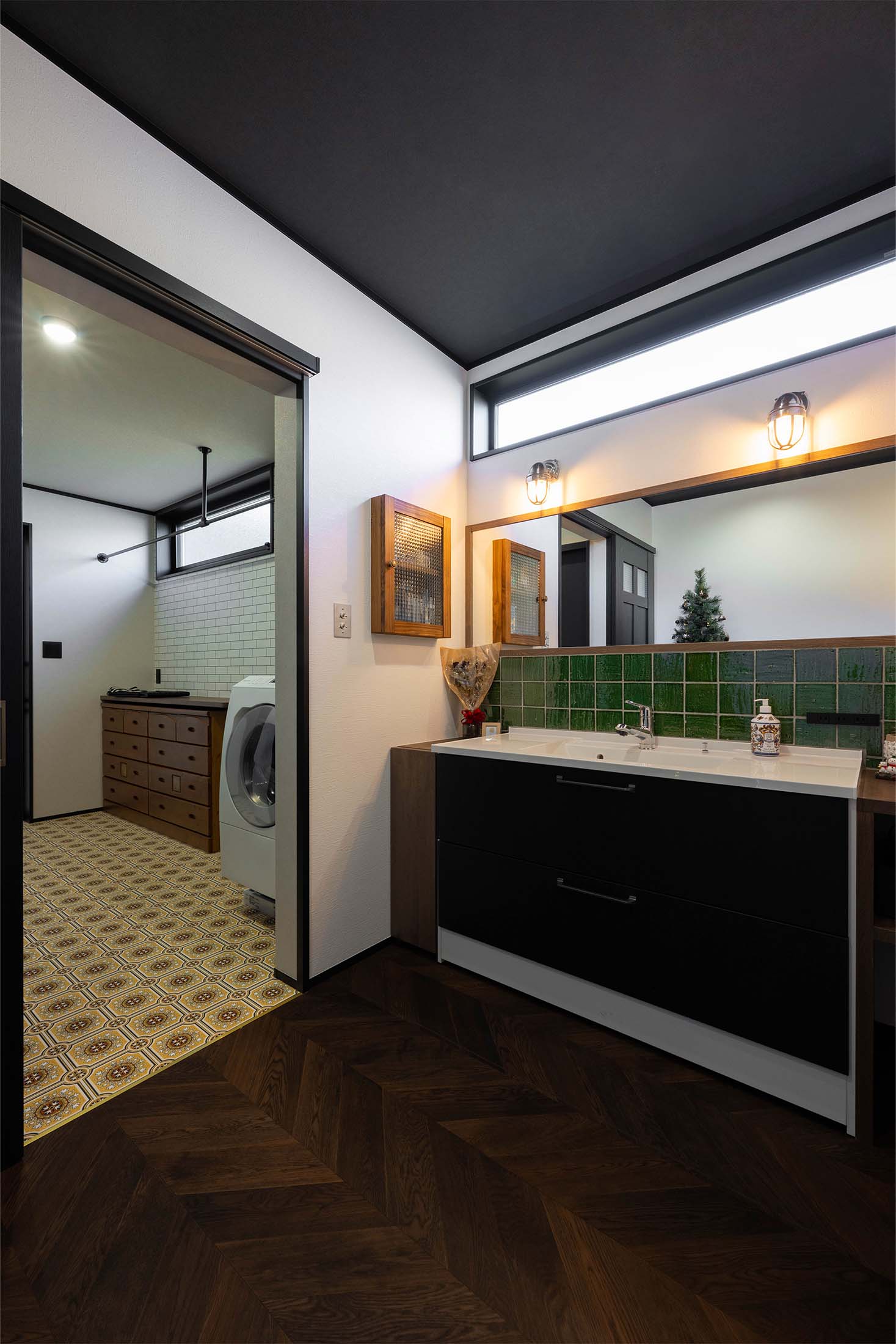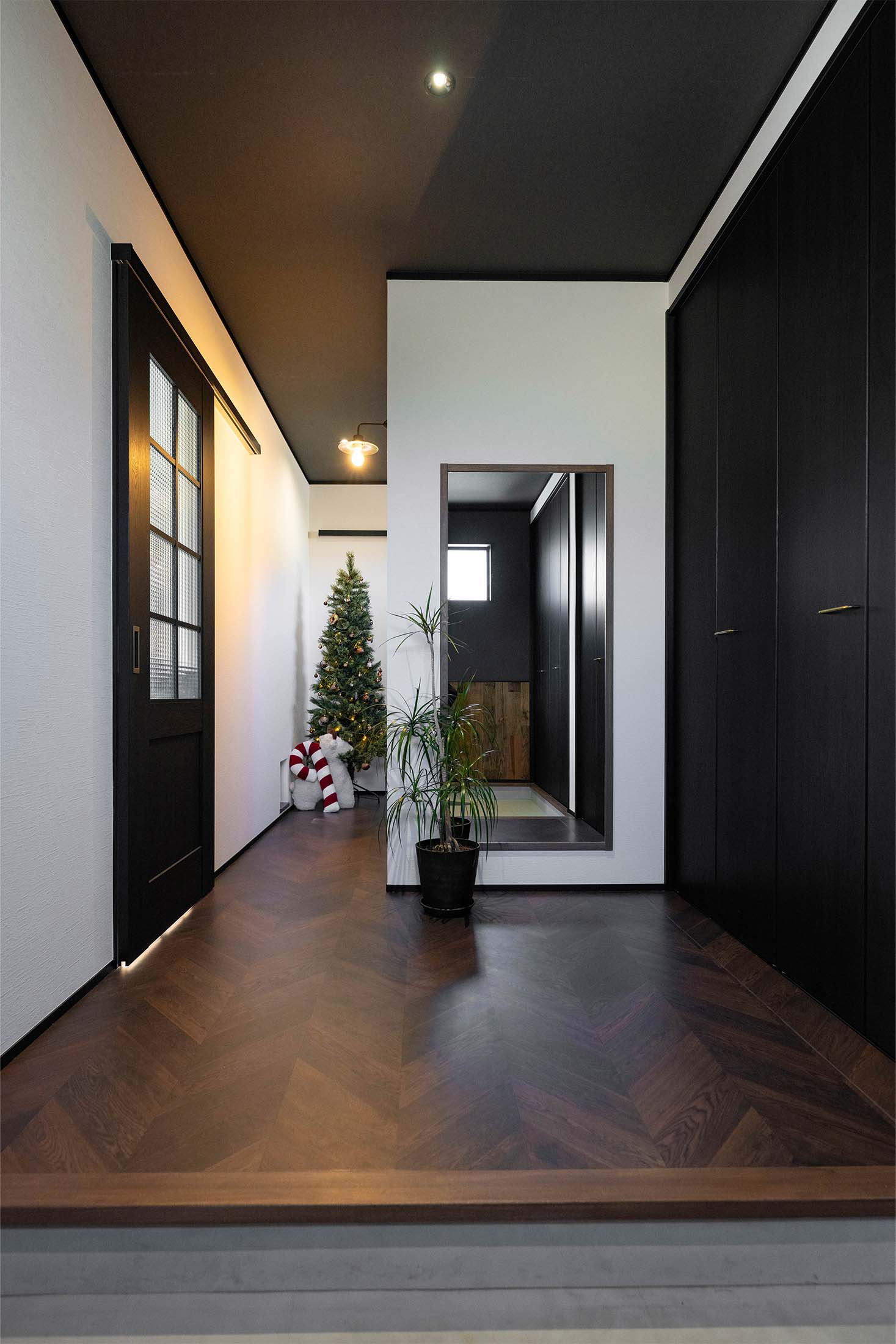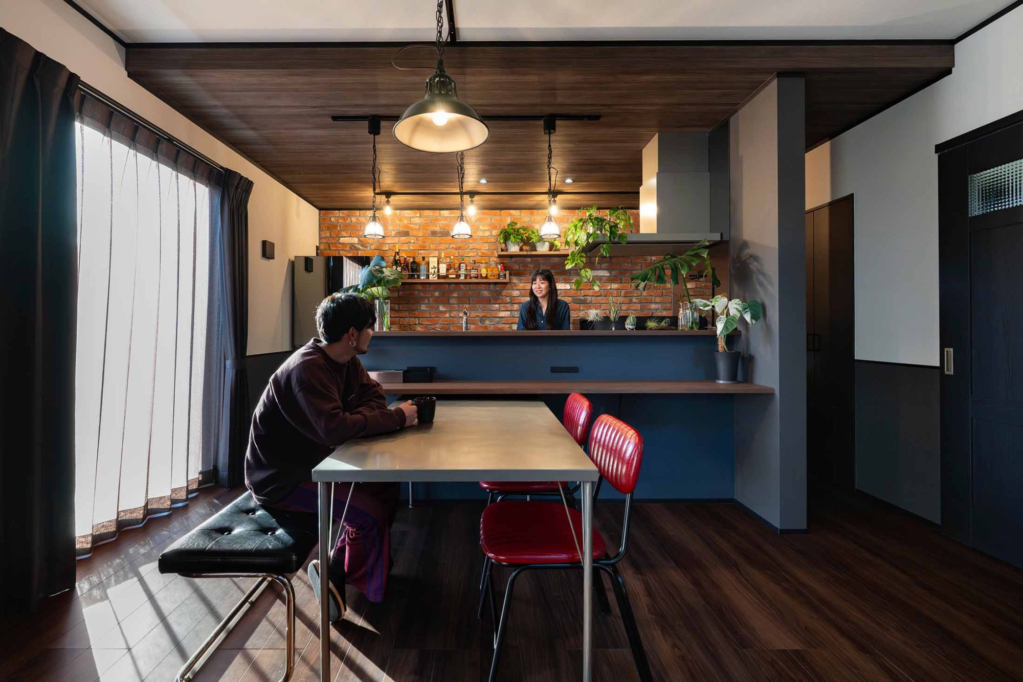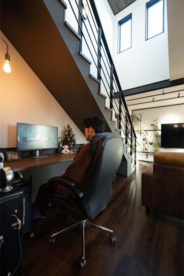 室内は、濃茶系色のフローリングに黒をベースにした建具など、ヴィンテージ感あふれる空間。アイアンの手すりがスタイリッシュなリビング階段と、その上部に広がる天井高約6mの吹き抜けが空間をより広く演出します。観葉植物の栽培が共通の趣味というご夫妻が植物を飾るためテレビの裏の壁に設置したエキスパンドメタルや、キッチンのレンガ調タイルもインダストリアルな雰囲気を演出します。